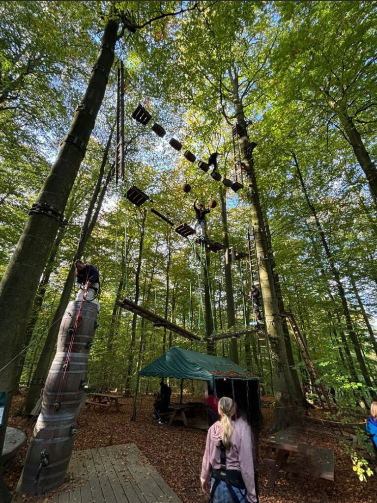 Am sonnigen 17. Oktober 2024 fuhr die Klassenstufe 7 der Heinrich- Andresen – Schule in den Hochseilgarten nach Eckernförde. Mit der Nordbahn ging es von Sörup aus über Lindaunis – hier überquerten wir zu Fuß die alte Brücke – und fuhren weiter nach Eckernförde. Zu Fuß spazierten wir an der schönen Strandpromenade entlang Richtung Hochseilgarten. Dort erwartete uns bereits das Trainerteam und wies uns in die Handhabung der Sicherungsgurte mit den Karabinern ein. Als unsere Schüler und Schülerinnen endlich die Erlaubnis erhielten, den Kletterpark mit den unterschiedlichen Schwierigkeitsstufen zu bewältigen, liefen sie in kleinen Gruppen los. Sie kletterten über wacklige Hängebrücken von Baum zu Baum, schwangen sich mit Seilen von einer Plattform zur anderen und loteten so ihre Grenzen aus. Die Jugendlichen wurden immer wagemutiger und feuerten sich gegenseitig an. Ein Teil traute sich sogar über mehrere Stationen hinweg auf ein vorstehendes Brett in den Baumwipfeln des Hochseilgartens. Aus schwindelerregender Höhe ließen sich von einer Plattform aus – unteren unter den motivierenden Rufen ihrer Mitschüler – in die Tiefe fallen. Die Freude über die gelungenen „Mutproben“ des Tages war riesig. Es war für uns alle ein wunderbarer, ja schon fast perfekter, Schulausflug.
